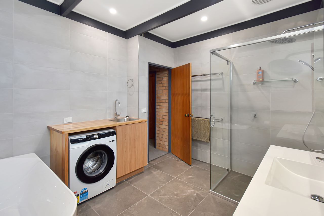 Bathroom/Laundry – Shower, front loading washing machine, laundry tub, vanity and separate toilet.